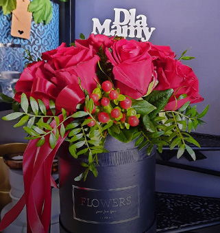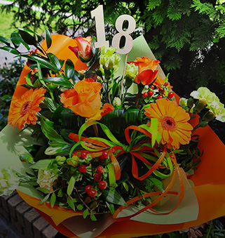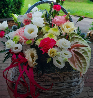 Skład: róże, eustomy, gerbery, goździki , alstromeria, gipsówka, zieleń dekoracyjna, folia ozdobna.