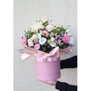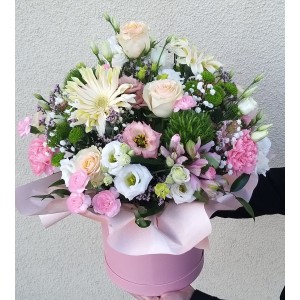 Skład: róże, santini, eustomy, goździki, gerbery, zieleń,dodatki kwiatowe, pudełko